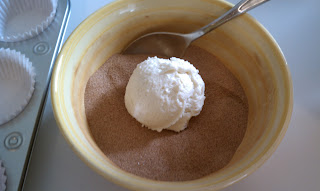 So, after making the batter, I used a large scoop and rolled the batter balls into cinnamon sugar and then put the batter into a lined muffin tin.